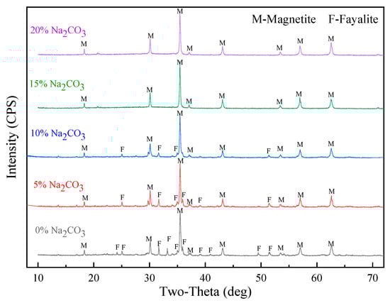 XRD was used to study the phase change in the modified Cu slag with different Na2CO3 contents. Results are shown in Figure 10. Increasing the Na2CO3 dosage gradually decreases the diffraction peak of fayalite until it disappears. The diffraction peak of magnetite is slightly strengthened. According to the principle of XRD, the ratio of peak areas in the XRD spectra is proportional to the mineral content, and the change in the diffraction intensity of the same minerals can approximately reflect the change in its content []. Therefore, when the amount of Na2CO3 increases from 0 to 20%, the content of fayalite decreases gradually until it disappears, and the content of magnetite increases slightly. This result justifies reactions (2)–(9). In addition, the diffraction peaks of fayalite disappear when the amount of Na2CO3 is 15%, which indicates that the fayalite in the slag has been completely decomposed by Na2CO3. If the amount of Na2CO3 continues to increase, the excess Na2CO3 precipitates as crystal in the cooling process of the Cu slag because it does not participate in the reaction. This result is in good agreement with that of the binary phase diagram of the Fe2SiO4–Na2CO3 system.