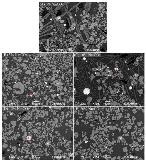 SEM images of Cu slag with different amounts of Na2CO3 (C—Cu-bearing minerals, M—Magnetite, F—Fayalite, G—Glassy silicates).