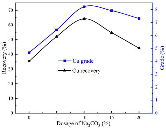 In Section 3.1, Section 3.2 and Section 3.3, the mechanism of Na2CO3 in the process of Cu slag melting modification is analyzed from three aspects, namely, thermodynamics, viscosity, and mineralogical characterization. In this section, the actual effect of Na2CO3 on the Cu slag melting modification is investigated by comparing the Cu recovery of modified Cu slag with different Na2CO3 dosages. The results are shown in Figure 12.