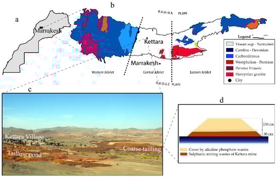 The studied site is the abandoned mine in Kettara (470 masl, 31°51′36′′ N and 8°9′36′′ W) located 35 km north-northwest of the city of Marrakech (Figure 1a,b). The area is characterized by semi-arid bioclimatic conditions [,].