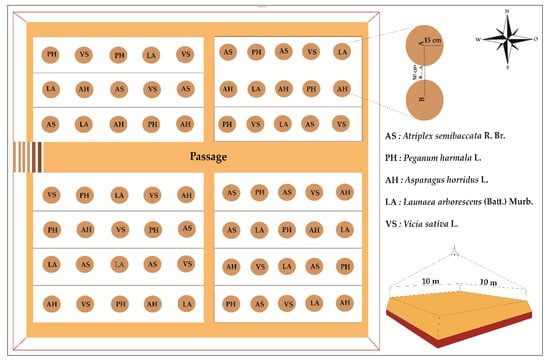 The five plant species used in this field experiment were selected according to their performance from preliminary greenhouse results [], and to their botanical and ecological characteristics: namely, Vicia sativa L., Asparagus horridus L., Peganum harmala L., Launaea arborescens (Batt.) Murb., and Atriplex semibaccata R. Br. Fourteen plants of each species of similar sizes, growth (2 months), and general aspects were randomly transplanted into the plot in February 2018 (Figure 2).