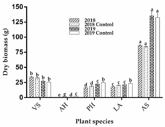 Aboveground dry biomass per plant measured at the end of each growing season for the five species: VS: Vicia sativa L., AH: Asparagus horridus L., PH: Peganum harmala L., LA: Launaea arborescens (Batt.) Murb., and AS: Atriplex semibaccata R. Br. Note: Different letters above columns of different plant species indicate significant differences (p < 0.05).
