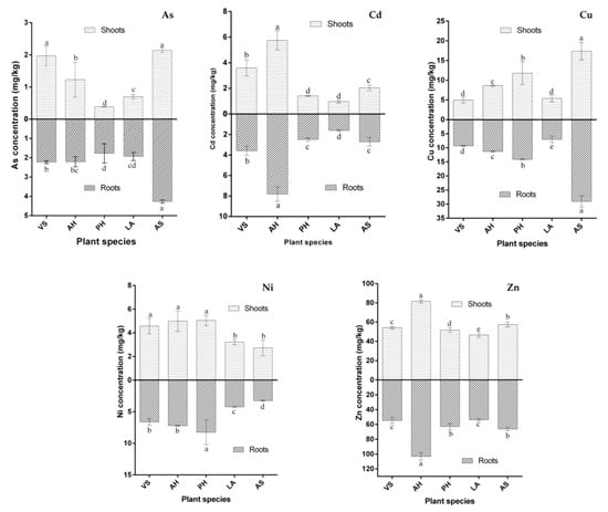 Concentrations of As, Cd, Cu, Ni, and Zn in shoots and roots of the five plant species. Abbreviations are the same as in the plant scheme in Figure 2.