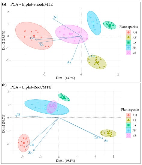 Principal component analysis (PCA) obtained for the concentrations of five metallic trace elements (MTEs) in the shoots (a) and the roots (b) of the plant species Asparagus horridus L. (AH), Atriplex semibaccata R. Br. (AS), Launaea arborescens (Batt.) Murb. (LA), Peganum harmala L. (PH), and Vicia sativa L. (VS).