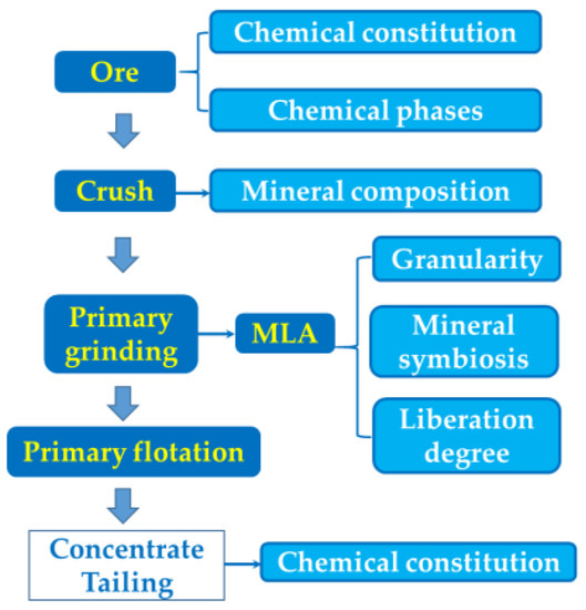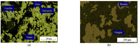 Cobalt is known for its excellent performance, and thus widely employed in machinery, electronics, electric power, automobile, construction, and many other industries. The global consumption of cobalt is expected to undergo a three-fold increase in the next 10 years [1,2,3]. According to the United States Geological Survey (2017), most of the world’s tradable cobalt reserves were found in the sediment-hosted Cu–Co deposits in the Democratic Republic of Congo (DRC), where cobalt sulfides were recovered as a by-product of copper minerals [4,5,6]. Copper is also a widely employed metallic element [7]. Hence, the improvement of cobalt recovery depends on the synchronous recovery of copper–cobalt sulfides [8]. The mineral composition of copper–cobalt ores is more complex than that of copper sulfides, and it falls under the difficult beneficiation type [9]. Therefore, beneficiation researchers from all over the world have made numerous attempts to concentrate copper–cobalt sulfide ores. At present, the separation methods used for copper–cobalt sulfide ores include the following: Duan et al. [10] improved the recovery rate of copper–sulfur minerals by changing the reagent system. Ba et al. [11] adjusted the process flow and used combined flotation–magnetic separation technology to recover cobalt minerals, which are difficult to enrich. However, the large-scale use of reagents exerts high environmental impact, and ideal process indicators are difficult to obtain even with complex processes. Tijsseling et al. [2] adopted a two-stage roughing process: the first step is the separation of sulfide in the ore for use as potential sulfidation material for the sulfidization of the remaining oxides, and the second step is recovery. However, the flotation concentrate tends to contain a large amount of carbonate and silicate minerals. Moreover, the selectivity of the flotation process tends to be low because of the absence of a clear guideline on the choice of particle size for middling. Some low-efficiency methods, such as biological leaching and ammonium salt roasting, could hardly separate copper and cobalt sulfide ores [12,13,14,15]. In sum, concentrating copper cobalt sulfide ores remains challenging, and many mechanisms of separation have yet to be revealed. Information such as the composition, embedded characteristics, crystal size, and crystal structure of minerals from the microscopic view is obviously needed to reveal the common characteristics that support comprehensive concentrating in primary flotation. Meanwhile, new theories are also necessary to organize test results and break through the technological limitations of concentrating copper and cobalt minerals.