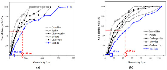 The granularity dissemination of most of the sulfide minerals and aggregates. (a) −0.074 mm (65%); (b) −0.074 mm (85.64%).