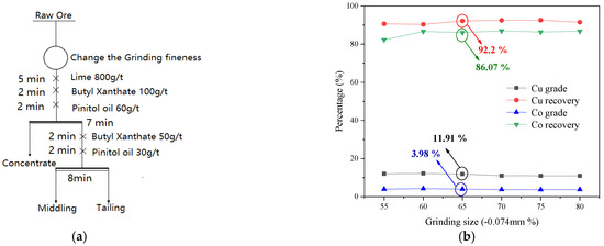 Effect of grinding size on the recovery of sulfide aggregates. (a) The flow chart for flotation experiments (b) Effect of grinding size.