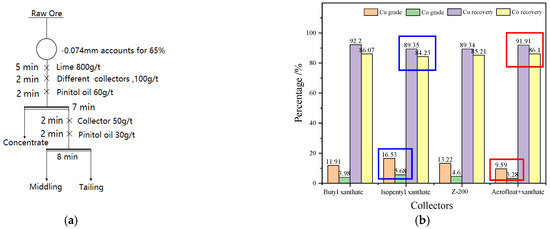 Effect of collector type on the recovery of sulfide aggregates. (a) The flow chart for flotation experiments (b) The result for flotation experiments.
