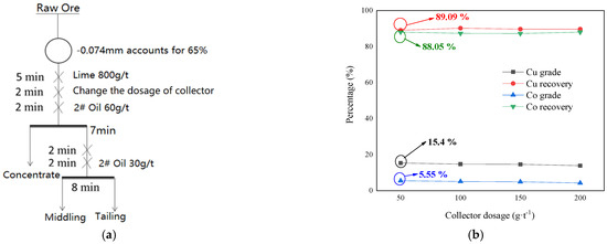The grades and recoveries of Cu and Co changed only slightly as the collector dosage increased from 50 g·t−1 to 200 g·t−1. Given the recovery value of metals, Co was prioritized over Cu as a recovery indicator. Thus, the collector dosage of 50 g·t−1 was selected to reduce cost. At the selected condition, 86.35% of the ore weight was discarded as tailing when the recoveries of Cu and Co were 89.09% and 88.05%, respectively.