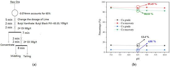 As shown in Figure 9, the recovery presented a minimal and uncertain correlation with pH variation. The recovery of copper and cobalt increased linearly with the increase in pH from 8.5 to 9.0. The grade and recovery remained unchanged at pH 9–10. Hence, 9.0 was selected as the optimal pH because the recoveries of copper and cobalt reached their high points at this pH. At the selected condition, 85.07% of the ore weight was discarded as tailing when the recoveries of Cu and Co were 89.45% and 88.03%, respectively.