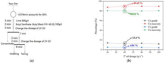 Effect of 2# oil dosage on the recovery of sulfide aggregates. (a) The flow chart for flotation experiments (b) Effect of 2# oil dosage on the flotation recovery.