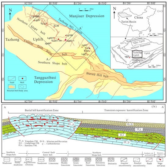 Location and geology of study area. (a) Tectonic division of Tazhong Uplift and location of study area [19]; (b) karstification division of Tazhong Uplift and location of northern slope belt.