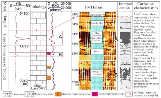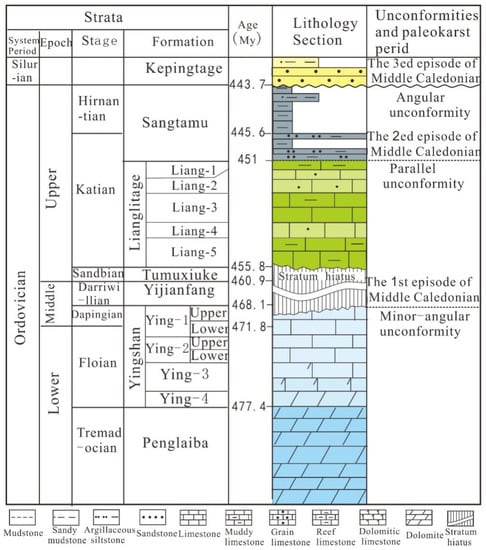The Tazhong Uplift is located in the central Tarim Basin in northwestern China (Figure 1a). Its western part is connected with the Bachu Fault Uplift, and its eastern part is connected with the Tadong Uplift. The north is close to the Manjiaer depression, and the south is the Tangguzibasi depression, which is northwest-trending [9,29]. The Tazhong Uplift from north to south can be divided into three sub-structural zones, namely the northern slope, the central uplift, and the southern slope [19]. The first exploration in the Tazhong area was of the Middle Ordovician karst reservoir in the central uplift, which is directly covered by the Carboniferous (Figure 1b). The exposure time is greater than 100 My, and the karst time is long, forming a karst buried hill reservoir (Figure 1). In recent years, the exploration has been concentrated in the northern slope zone, which is also the research area of this paper. A set of calcarenite and micrite of carbonate open platform facies was deposited in the Middle-Lower Ordovician Yingshan Formation in this area [30]. At the end of Middle Ordovician, affected by the tectonic movement in the Middle Caledonian period, Episode I, the carbonate rocks of the Yijianfang Formation and the Yingshan Formation, which were newly deposited, were uplifted as a whole, resulting in the exposure of the carbonate platform and strong karstification [31,32] (Figure 2). After the exposure of the carbonate rocks, it was not until the Late Ordovician, during the deposition of the Lianglitage Formation, that the seawater slowly invaded from east to west again. A set of grayish-green marlstone of mixed continental shelf facies was deposited at the bottom of the Lianglitage Formation, which was a result of transgressive deposition [33].The strata in the high part of the uplift are deeply eroded, and most of them lack the Middle Ordovician Yijianfang Formation and the Tumuxiuke Formation at the bottom of the Upper Ordovician, while the Yingshan Formation of the Lower Ordovician is also eroded, and the amount of erosion increases gradually from north to south. The exposure duration of the Yingshan Formation is about 7–8 My [20], forming the current unconformity (Figure 1b and Figure 2). The Yingshan Formation can be divided into four members, of which the first and second members are relatively pure limestone with a thickness of about 300 m. The third and fourth members are dolomitic limestone and dolomite (Figure 2). The exposed strata are limestones of the first and second members, developing a large number of fractures and caves during the exposure weathering and transgression during the deposition of the Lianglitage Formation, which is an important oil and gas reservoir in the Tarim Basin [7].