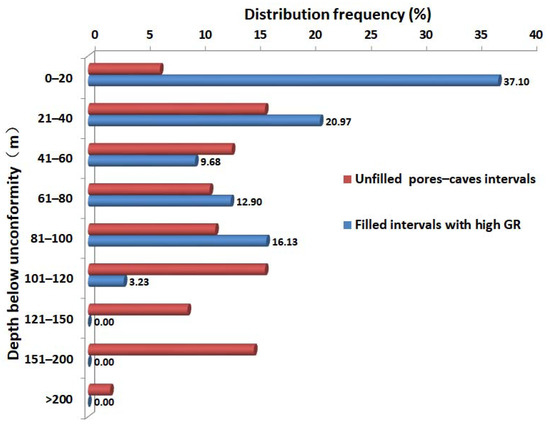 Dan et al. [20] identified mud-filling and unfilled intervals of 90 wells in the area, based on core, imaging logging, conventional logging interpretation, and drilling and logging methods and found that there are 61 mud-filling intervals [20]. These mud-filling intervals often show high GR (Gamma-ray log) intervals (the GR value is generally 75–150 API) on logging curves (Figure 3). It was found that 58.07% of all the 61 mud-filling intervals developed at 0~40 m below the unconformity (Figure 4). The number of filled intervals decreased with the increase in depth, reaching a low value of 9.68% at 40~60 m, and increased to a peak of 16.13% at 80~100 m after 60 m, while the number of filled intervals decreased sharply over 100 m. According to the statistics of the unfilled caves, the unfilled caves are not developed in 0~20 m under unconformity, relatively developed after 20 m, and less developed over 200 m (Figure 4). The above shows that the caves near the unconformity surface are mostly filled by mud fillings, which also reflects that the filling has a great influence on the reservoir exploration of the Yingshan Formation in the northern slope of Tazhong, and the filling is stronger near the unconformity surface than the lower part. Therefore, studying the source and filling environment of the mud fillings are of great significance for understanding the filling process of oil and gas reservoirs and predicting the distribution of unfilled reservoirs in this area.