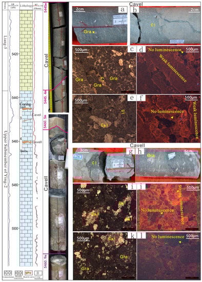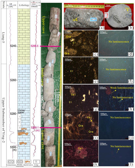 The petrological characteristics of karst pore and cave fillings of the Yingshan Formation in Well LG43-1. (a,b) Karst cave fillings show limestone gravel (Gra), clay (Cl), and calcite (Cal), and the fillings are relatively soft; (c,e,g,i) limestone debris grains (Gra), clay (Cl), calcite (Cal), and karst caves. Generally, fillings in karst caves do not show luminescence (d,f,h,j) and minor karst caves do not show luminescence (h), 5288.5–5289.1 m; (k,l) calcite in pores in the lower part of karst caves did not show luminescence, 5289.2 m.