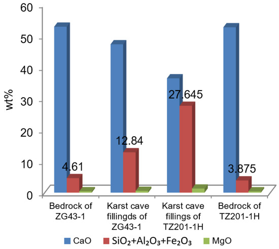 The CaO content in the limestone of the Yingshan Formation near the karst caves of the two wells is 54–57%, and the SiO2, Al2O3, and Fe2O3 contents are extremely low, with the total content not exceeding 5%. The content of CaO is 30–40%, followed by SiO2, Al2O3, and Fe2O3. The main component of the clay minerals is aluminum silicate; so, the content of the clay minerals is approximately equal to the SiO2 + Al2O3 + Fe2O3. The content of the clay minerals in the cave filling is about 17–39% (Figure 7), which is quite different from the bedrock test results. The CaO content of the TL201-1H cave fillings is high, with an average of 35%, followed by the clay, with an average of 21.65%. The clay content of the LG43-1 karst cave fillings is high, with an average of 37.34%, followed by the CaO, with an average of 22.31%, indicating that the clay content of the LG43-1 karst cave fillings is higher than that of the TL201-1H karst cave fillings, but the carbonate rock debris is less. The above analysis shows that the types of cave fillings are basically the same, but different types of content in different wells have a large gap, which may be related to the distance between the cave and the unconformity surface, the karst landform, and the filling environment.