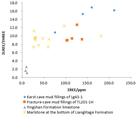 (1) Total rare earth (ΣREE): Total rare earth can reflect the relevant information of a fluid source. Among the tested samples of mud fillings, the total rare earth in LG43-1 was 75.3–210.9 ppm, with an average of 146.2 ppm. The total rare earth in TL201-1H was 102.4–137.5 ppm, with an average of 117.0 ppm. The total rare earth in the limestone of Yingshan Formation near the fracture-cave was 13.05–26.21 ppm, with an average of 17.65 ppm. The total rare earth in the bottom of the Lianglitage Formation was 26.7–164.34 ppm, with an average of 49.16 ppm. Except for TL201-1H, the argillaceous strip of marlstone was 164.34 ppm, and the total rare earth in the bottom of the Lianglitage Formation was less than 100 ppm.