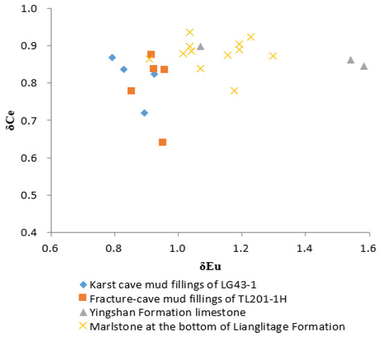 (3) δEu and δCe anomalies: Eu and Ce will show abnormal valence changes in different environments, thus providing important information on the filling environment. The δCe of all the kinds of samples is less than 1, which is a negative anomaly, while the δEu is less than 1, which is 0.79–0.96, and is a negative anomaly in both wells (Figure 9). The limestone of Yingshan Formation and the marlstone of Lianglitage Formation are normal.