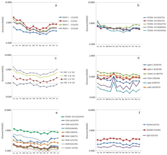 (4) Rare earth distribution pattern: The rare earth element standardization of sedimentary rocks usually uses North American shale (NASC) or post Archean shale (PAAS) as the standard value [46]. In this paper, the NASC standard value, remeasured by Gromet et al. (1984), is used for standardization [47], and then the logarithm of the standardized value is used as the ordinate, and the order of La to Lu is used as the abscissa to make the REE swallow curve (Figure 10). Because the fillings from the different sources have different REE distribution patterns, the nature and source of the filling fluid can be judged by the analysis of the distribution pattern morphology and the comparison of the REE distribution patterns in different strata [48]. The rare earth distribution patterns of different samples are as follows: