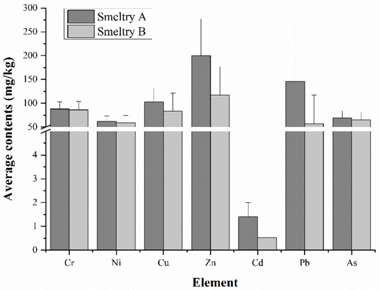 The average contents of all seven toxic elements around the two smelteries exceeded the local soil background values [18,19]. The detected contents of Cu, Cd, Pb, and As in farmland soil near Smeltery A were 4.68, 15.56, 6.64, and 4.93 times the background content, respectively. The contents of Cu, Cd, and As in the soil near Smeltery B were 3.77, 5.89, and 4.64 times the background content, respectively. Cd was the most serious metal around the two smelteries that exceeded the background value. Pollution by these heavy metals was mainly caused by the large amount of industrial dust produced during the process of heavy metal smelting and soil pollution caused by long-term atmospheric particulate matter deposition [21]. Compared with the risk control standard for the soil contamination of agricultural land promulgated in 2018 [20], Cu, Cd, and As in soil around Smeltery A and As in soil near Smeltery B exceeded the risk screening value of soil pollution on agricultural land. The contents of other elements did not exceed the standard limits. These results indicate that there may be risks when land is used for agriculture, and safety measures, such as agronomic regulations, should be implemented.