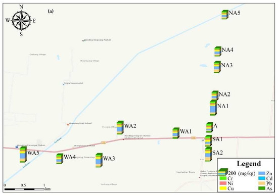 The analysis of the spatial distribution of the seven heavy metals is helpful to identify areas with high concentrations and evaluate the main sources of heavy metals [24]. The distribution of the seven heavy metals around Smeltery A and B are shown in Figure 3.