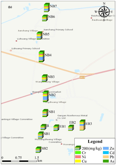 - Shen, F.; Liao, R.; Ali, A.; Mahar, A.; Guo, D.; Li, R.; Sun, X.; Awasthi, M.K.; Wang, Q.; Zhang, Z. Spatial distribution and risk assessment of heavy metals in soil near a Pb/Zn smelter in Feng County, China. Ecotoxicol. Environ. Saf. 2017, 139, 254–262. [Google Scholar] [CrossRef]