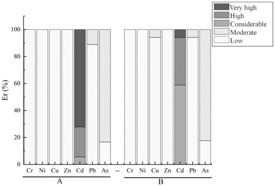 Distribution results of heavy metals in soil according to the single factor potential ecological risk index. A—Smeltery A; B—Smeltery B.