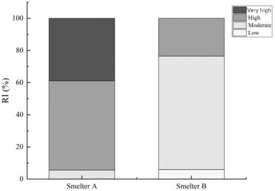 The comprehensive potential ecological risk (RI) assessment of multiple heavy metal elements can reflect the overall risks of the heavy metals around two smelteries. As seen in Table 5 and Figure 5, the average RI value of Smeltery A was greater than 300, which is generally at the level of high ecological hazard. The RI value of the most polluted sample near Smeltery A was 1183.15, and the level of strong ecological hazard is at a value of 600, so this sample with the highest pollution degree had a value 1.97 times higher than that of strong ecological hazard. The average RI value of Smeltery B was 263.66, and the overall ecological damage was at a medium level, while the degree of ecological damage at Smeltery B was relatively light. Among the samples taken near Smeltery B, about 23.53% were at the level of high ecological damage. The main heavy metal pollutants of soil near both smelteries were Cd and As, with Cd making the largest contribution.