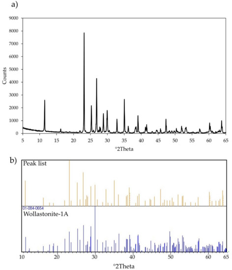 The sample is supplied in powder form, so it does not need to be milled before running the analysis. Wollastonite powder was mounted in sample holders using a side-loading technique. A step scan of 0.02 °2θ was used with a time of 3 s/step in the 5–65° 2θ range. The incident beam pathway included: 1/2° divergence slit, 1/2° anti-scattering slit. The XRPD pattern of wollastonite NYAD G was analysed using the X-Pert High Score Plus suite [62].