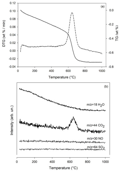 Thermogravimetric (TG) analyses were performed with the thermal analyser Seiko SSC 5200 (Seiko Instruments Inc., Chiba, Japan) paired with a quadrupole mass spectrometer (ESS, GeneSys Quadstar 422) to analyse gases released during thermal reactions (MSEGA) (ESS Ltd, Cheshire, UK) mpling is through an inert, fused silicon capillary system, heated to prevent condensation. The intensity of the signal of selected target gasses were collected in multiple ion detection mode (MID) using a secondary electron multiplier operating at 900 V. More specifically, we measured the intensity of the signals of the m/z ratios 18 for H2O, 30 for NO, 44 for CO2, 64 for SO2, where m/z is the ratio between the mass number and the charge of the ion. The heating condition were 20 °C/min in the thermal range 25–1000 °C using ultrapure helium at a flow rate of 100 μL/min as purging gas.