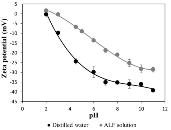 Results of the zeta potential analyses as a function of pH are illustrated in Figure 4. Overall, when the pH of the suspension increases, the zeta potential decreases in both double-distilled water and ALF solution (Figure 4). In the pH range between 2 and 11, the zeta potential of the sample varies from −0.3 to −39 mV in double-distilled water, and ranges from 1.6 to −28 mV in ALF solution.