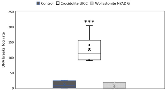 The presence of double-strand breaks in the DNA of THP-1 monocytic cell line were analysed by evaluating nuclear γH2AX histone foci [73]. THP-1 monocytes were seeded in eight-well Lab-Teck chambered slides at 75,000 cells/well in complete medium and the day after they were induced to polarize to M0 macrophages by adding 20 ng/mL phorbol-12-myristate 13-acetate (PMA, PeproTech EC, London, UK) to the culture medium for 48 h. Subsequently, non-adherent cells were removed and M0 macrophages and incubated or not (control) with 50 µg/mL of crocidolite UICC or wollastonite NYAD G. After 24 h, cells were stained with anti-γ H2AX antibody (Abcam), while the nucleus was coloured with 2 µg/mL propidium iodide. Images were acquired with a Leica TCS SL confocal microscope with an HCX PL APO CS 63.0 × 1.40 oil objective. The nuclei images (4.0 × digital zoom) were acquired with the fluorescent foci of double-strand breaks in the DNA in green and the propidium iodide-positive nuclei in red (excitation at 488 nm for both and emission range of 500–550 nm and 600–670 nm, respectively).