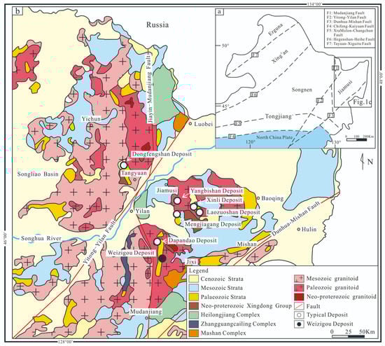 (a) Tectonic location map of Northeast China (modified after Wu et al. []); (b) regional geological map of Jiamusi Area (modified after Wang et al. []).