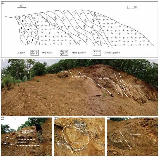 The profile of ore body exposed to the surface can be seen in the mining area (Figure 3a,b). From the profile, it is clear that the veined meta-gabbro intrudes into the granitic gneiss (Figure 3c), the xenolith of granitic gneiss can be seen in the meta-gabbro (Figure 3d) and the ore body in close contact with the metagabbro (Figure 3e).