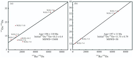 The Re-Os isotopic data of eight pyrite samples from the Weizigou deposit are presented in Table 1. The Re and 187Re concentrations range from 0.383 to 9.463 ng/g and 0.241 to 5.951 ng/g, while the common Os and 187Os concentrations range from 0.0010 to 0.0382 ng/g and 0.0017 to 0.0758 ng/g, respectively. The 187Re/188Os and 187Os/188Os ratios are 432–6894 and 10.92–33.59, respectively. The eight samples yielded an isochron age of 196 ± 110 Ma (Figure 5a). Excluding four distinct samples, four samples that yielded a revised isochron age of 197 ± 11 Ma (MSWD (mean squared weighted deviation) = 50) (Figure 5b) remained, with an (187Os/188Os)i of 11.15 ± 0.79.