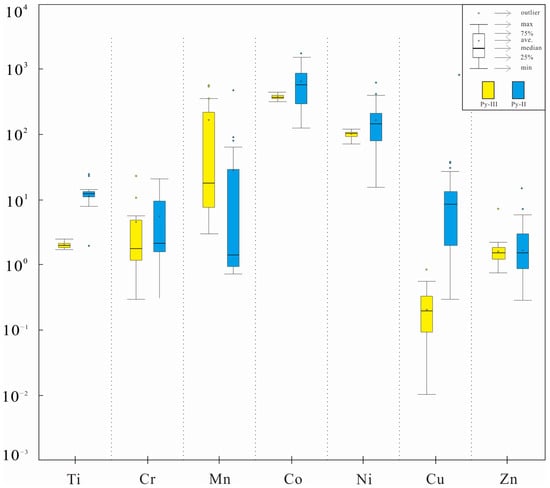Box and whisker plots of trace element concentrations (Ti, Cr, Mn, Co, Ni, Cu and Zn) determined using LA-ICPMS for different types of pyrite in the Weizigou deposit.