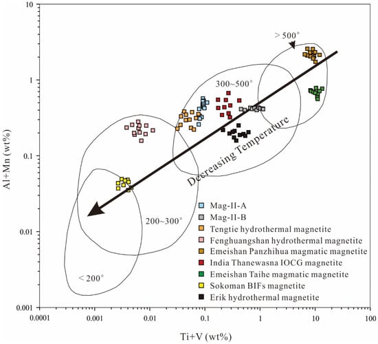 Magnetite (Al + Mn)–(Ti + V) formation temperature diagram (modified after Nadoll et al. []).