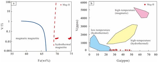 (a) Fe (wt %) vs. V/Ti discrimination diagram for magnetite proposed by Wen et al. []; (b) V vs. Ga content in magnetite and data for high-temperature magmatic, high–temperature hydrothermal and low-temperature hydrothermal magnetite collected by Salazar et al. [].