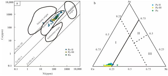 (a) Co-Ni discriminant diagram (after Bralia et al. []); (b) Co-Ni-As discriminant diagram (I-magmatic hydrothermal type; II-Carlin type; III-metamorphic hydrothermal type, after Yan et al. []).