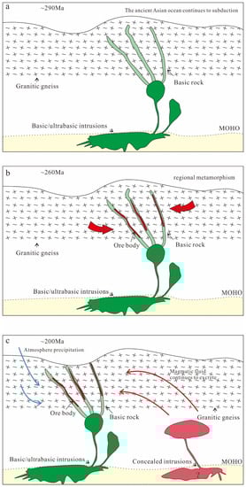 When considering the genetic type of the deposit, we found that the surrounding rocks of the ore body are granitic gneiss and meta-gabbro and that there are no carbonate rocks or typical skarn minerals, so the possibility that the deposit is skarn-type mineralization can be ruled out. The ore bodies occur in meta-gabbro in the veined form and no hematite or replacement of clastic sulfides can be seen, which does not support the halmyrolysis model [], so BIF and VMS-type mineralization can be excluded. The in situ LA-ICP-MS test results also show that the content of Ti and V in Mag-II is two to three orders of magnitude different from that of magnetite in magmatic deposits. This shows that the Weizigou deposit is also not related to the magmatic deposit.