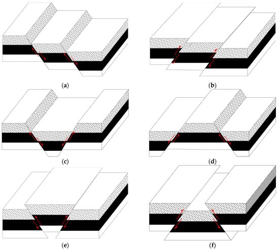 The scheme of the different two combined faults. (a) Plane view represents stair-stepping fault. (b) Plane view represents imbricate fault. (c) Plane view represents graben fault. (d) Plane view represents horst fault. (e) Plane view represents back thrust fault. (f) Plane view represents ramp fault. The red arrows represent the moving direction of the fault block. The black fill represents coal seams and others represent other sedimentary formations.