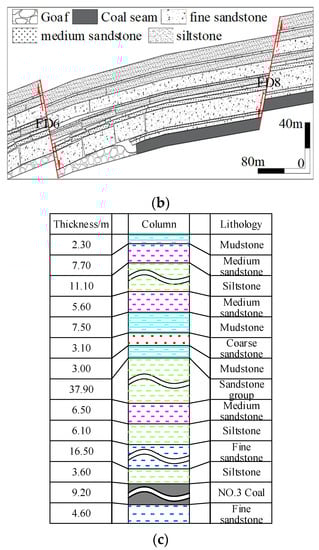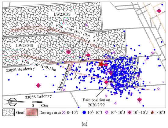 Figure 2a shows the panel layout and seismic events distribution (captured and calculated by seismic monitoring system) from the time the longwall started to retreat until rock burst occurred on longwall (LW) 2305S in the Xinjulong Coal Mine. To facilitate the understanding of roof strata of LW2305S, the A-A cross-section in Figure 2a is shown in Figure 2b, and the stratigraphic column of LW2305S is shown in Figure 2c. Two faults, i.e., FD6 and FD8 run through LW2304S and extend into LW2305S. As shown in Figure 2b, the two faults form a typical GFS. A tremendous amount of seismic events occurred near the LW2305S between the fault FD6 and FD8. Particularly, there were several high-magnitude events that exceeded 105 J, distributing at the area between two faults. It means that the area between the two faults has a significantly higher dynamic disaster risk than the other areas. On the one hand, the existed GFS will lead to specific roof structures (seen in Figure 2b) and further abnormal roof activity. Moreover, the GFS will reduce mine system stiffness and result in unstable failure of the mine system [].