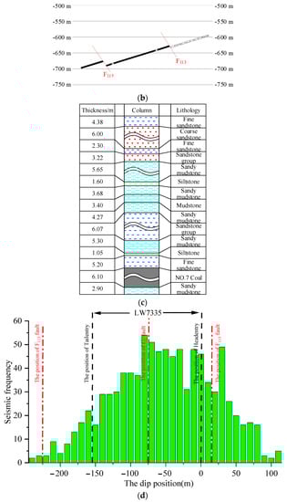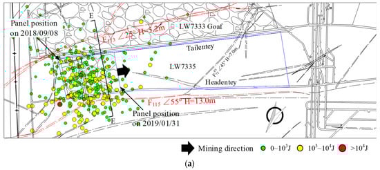 Similarly, there are stair-stepping faults detected in Xuzhuang Coal Mine, which is a typical burst-prone coal mine in Jiangsu Province, China []. As shown in Figure 3a, two faults, the F113 fault and F115 fault, existed on both sides of the retreat direction of LW7335. Moreover, the dip cross-section of coal mass formed a stair-stepping structure (seen in Figure 3b). Since 2014, the Xuzhuang Coal Mine was equipped with a seismic monitoring system called “SOS” developed by the Central Institute of Mining in Poland to continuously monitor seismicity related to mining activities. Lots of seismic events were detected during the LW7335 retreat between 2018/09/08 and 2019/01/31. As depicted in Figure 3d, many seismic events were distributed near the solid coal area and F115 fault rather than the goaf area. An extraordinary phenomenon also indicated that the special roof with stair-stepping faults could lead to an increasingly dynamic disaster potential.