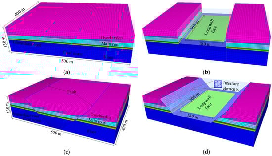 Taking the graben fault as an example, FLAC3D numerical modeling was performed to investigate the mechanical response caused by two combined faults. In the process, two numerical models (a base model and a graben fault model (GFM)) were established. The only difference between the base model and GFM is the presence of faults, as shown in Figure 4. Figure 4a,c show the numerical model without faults (base model) and with faults (GFM model), respectively. To show the longwall layout more clearly, the grids hyalinized over the longwall face in Figure 4a,c are shown in Figure 4b,d, respectively. The strata were simplified into floor, coal seam, immediate roof, main roof, and overburden according to the classical mining overburden movement theory [] due to the model not being targeted to a specific engineering context.