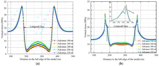 Vertical stress distribution curve (cross-section of 10 m in advance of the longwall face). (a) Base model; (b) Graben fault model.