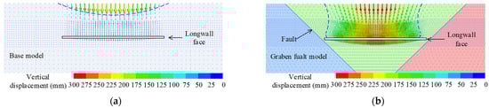 Vertical displacement distribution contour (cross-section of 30 m behind the longwall face). (a) Base model; (b) Graben fault model.