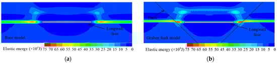 Elastic energy distribution contour (cross-section of 30 m behind the longwall face). (a) Base model; (b) Graben fault model.