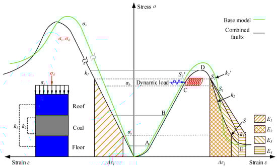It can be seen from Section 3.2 that the stress of coal pillars on both sides of the longwall significantly increases due to the presence of faults, which results in a significant increase in the stress level of the “roof–coal–floor” system (as shown by the green curve in Figure 8). In addition, the existence of combined faults reduces the overall stiffness of “roof–coal–floor” (seen in Section 3.2), which means that the stiffness of roof and floor and the unloading stiffness of coal increase significantly (roof and floor stiffness rise from point to point , and coal unloading stiffness rises from point to point