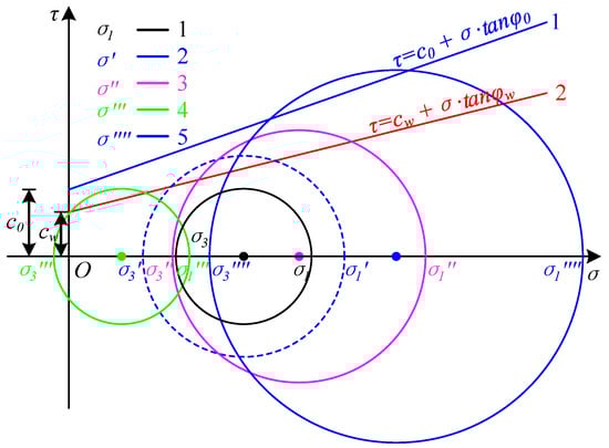makes changes. In this process, according to the Mohr–Coulomb strength criterion of single discontinuity [], rock mass failure occurs when the Mohr circle intersects or tangles the strength curve, as shown in Figure 9. It is further deduced that the smaller the distance between the Mohr circle and strength curve is, the worse the stability of the rock mass is and the more rock burst risk.
