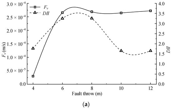 Figure 10a shows the distribution of DII and Fv with different fall throws during longwall retreat. It can be seen that DII fluctuates as the fault throw increases, and DII reaches the peak when the fault throw is between 6 and 8 m. In addition, Fv firstly increases with the increase in fault throw and then gradually stabilizes in a relatively stable range, which means that the increase in fault throw results in a limited disturbance of dynamic load. Comprehensively considering the response of DII and Fv to the increase in fault throw, the longwall has a relatively high rock burst potential when the fault throw varies from 6 to 8 m.